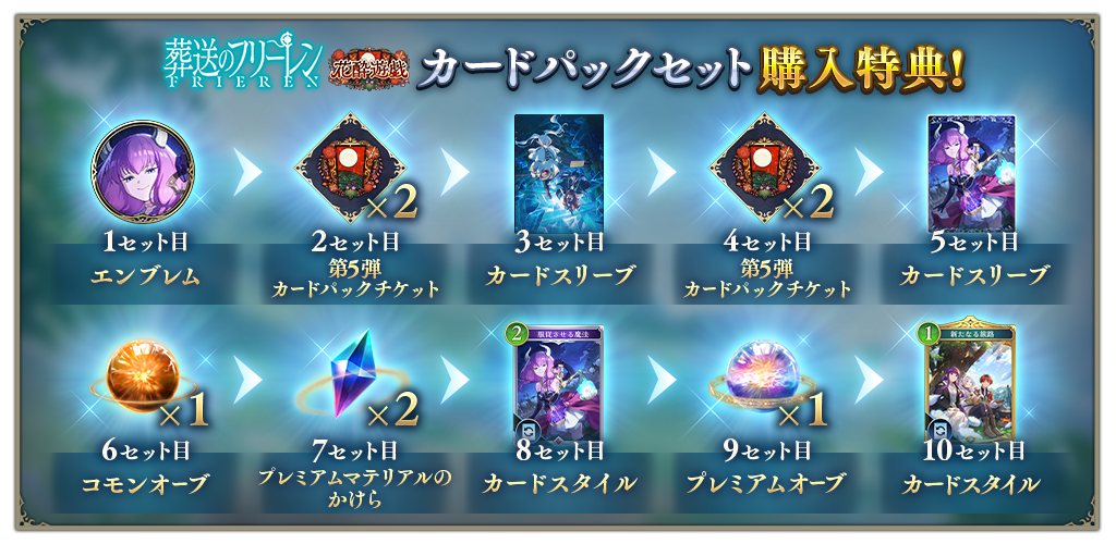 新たなる旅路は、2025年12月29日~2026年1月5日23時59分の期間内にゲーム内のショップから「葬送のフリーレンコラボ!花酔遊戯カードパック」10パックを10セット購入することで入手することができます。